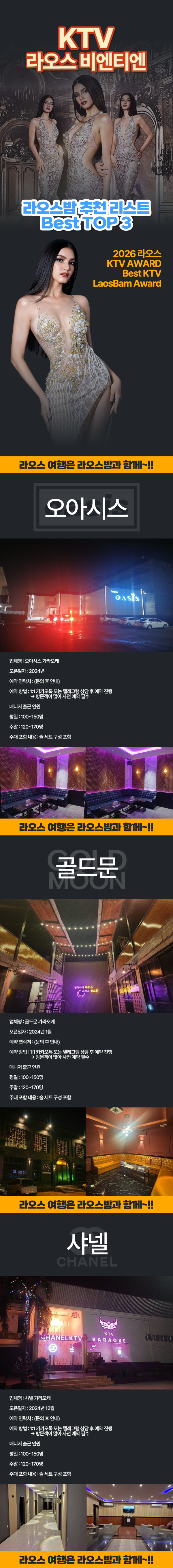 비엔티안 , 루앙프라방 , 방비엥이 한인전용 가라오케 및 로컬업소로 나눠어져 있으며 시스템은 대부분 비슷하게 운용되고 있습니다. 5시에 입장하여 6시전후에 푸싸오 초이스가 진행되며, 그 이후엔 모든코스는 룸에서부터 시작이 됩니다. 비엔티안 가라오케에서 가장 중요한 한인전용 가라오케는 골드문 가라오케와 오아시스 가라오케 , 캐슬 가라오케가 강세이며, 골드문 가라오케와 오아시스 가라오케 두 곳은 한인사장님이 운용중이시며 인기또한 매우 많습니다. 매콩 가라오케는 한인사장은 아니지만 어느순간부터 한인전용으로 바뀌면서 탑권을 지키고 있습니다. 방비엥 가라오케는 99KTV 가라오케와 팡팡노래방이 강세이며, 너무 메인이다보니 예약부분에서 많은 어려움을 겪으실수도 있습니다. 한인전용 가라오케는 대부분 경쟁이 치열하기 때문에 미리 예약을 주셔야 이용해보실 수 있습니다. 라밤은 전 지역 인기KTV 중에서도 최고의 수질을 보장드리며 내상없는 밤문화 여행으로 인도해드릴 것을 약속 드립니다.