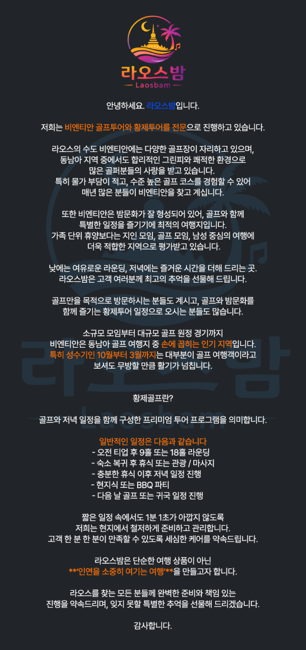 우선 라밤을 찾아주신 모든 사장님들께 감사 인사 올리겠습니다. 저희 라밤은 라오스의 밤문화 전문 가이드로써 모든여행자분들에게 잊지 못할 여행으로 만들어 드리는 밤문화 전문입니다.